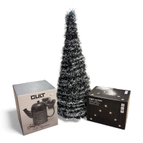 Julpaket – konstgjord gran, ljusslinga & Cult Design kaffekanna