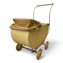 Charmig äldre dockvagn i gulmålad plåt med tygkåpa och metallunderrede.