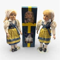 Tre porslinsdockor klädda i svensk folkdräkt i blått och gult. Dockorna har porslinshuvuden med målade ansikten samt textilkläder med broderade detaljer, förkläde och huvudduk. Stående på runda fotställ.