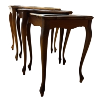 Tre satsbord i trä med svängda ben. Skivor belagda med kakelplattor dekorerade med rokokoinspirerade ornament och figurmotiv i pastellfärger.