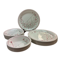 Servisdelar bestående av tallrikar och djupa tallrikar i fajans, dekorerade med stiliserat blomstermotiv i rosa och grönt samt kantlinje i rosa .