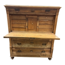 Klaffbyrå i trä med nedfällbar skrivklaff. Inredning med mindre lådor samt skåp. Underrede med två större lådor. Beslag i metall. Stående på svarvade ben.