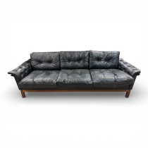 Tredelad soffa, modell Kardinal, formgiven för IKEA. Stomme i trä. Klädd i svart läder med knapphäftning i rygg och sits. Lösa sitt- och ryggdynor. Ben i trä.