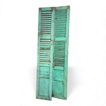Ett par antik fönsterluckor i trä, vackert åldrade med original turkos/grön färg och naturlig patina. Luckorna har klassiska lameller upptill och speglar nedtill, vilket ger ett tidstypiskt och mycket dekorativt uttryck.