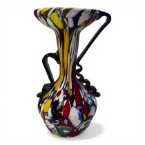 Dekorativ och iögonfallande konstglasvas med rik färgsättning i rött, gult, blått, grönt och vitt. Utförd med avancerad teknik där färgade glaspartier smälts samman i ett levande mönster, typiskt för millefiori- och Murano-inspirerat glas.
