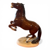 Porslinsfigur föreställande stegrande häst, tillverkad av Hertwig Katzhütte, Tyskland. 1900-tal. Dekorativ modell med fin glasyr och färgspel.