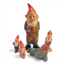 Två mycket charmiga samlarfiguriner föreställande klassiska tomtar i olika storlekar. Figurerna är utförda i traditionellt bemålat lergods (terrakotta) med en delvis glaserad finish. Sannolikt tillverkade i Tyskland (t.ex. Gräfenroda eller Heissner), kända för sitt högkvalitativa hantverk av trädgårds- och jultomtar