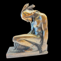 Dessa bokstöd föreställer en knäböjande, stiliserad figur med huvudbonad och är ett typiskt exempel på Art Deco-formgivning.