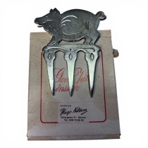 En charmig och tidlös skinkgaffel (även kallad julgaffel) utförd som en stiliserad gris. Detta är ett klassiskt tillbehör till det svenska julbordet, perfekt för servering av julskinkan. Föremålet kommer i sin tillhörande originalkartong från den anrika butiken Juvelerare Hugo Nilsson på Östergatan 11 i Malmö