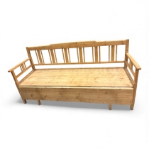 Rustik kökssoffa i furu med spjälrygg och öppna gavlar. Klassisk modell med uppfällbar sits och generöst förvaringsutrymme. Avlutad yta som framhäver träets karaktär. Stabil och i gott bruksskick med åldersrelaterad patina.