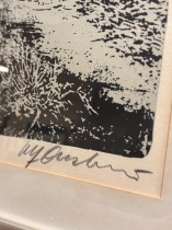 Litografi med titeln ”Hus vid fält” av Ulf Onsberg. Svartvitt motiv med öppet landskap och byggnad i bakgrunden, utfört i ett grafiskt och stämningsfullt uttryck med tydlig struktur och kontrast.