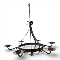 Äldre ljuskrona utförd i smitt järn med sex ljushållare arrangerade runt en cirkulär stomme. Konstruktionen har dekorativa smidda detaljer med svängda former och tvinnade armar. Upphängning med krok i ovankant.