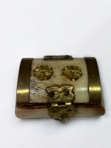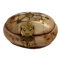 Oval dosa utförd i ben/tänder ofta från Kamel , rikt dekorerad med geometrisk intarsia och infällda mässingsdetaljer i form av cirklar och linjer. Lock med gångjärn och låsbeslag i mässing. Ytan uppvisar naturlig patina, åldersrelaterade missfärgningar och mindre slitagemärken som är förenliga med äldre hantverk.