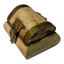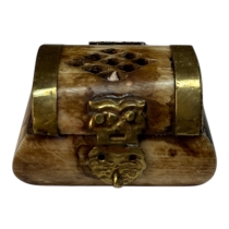Rektangulär dosa utförd i ben/tänder ofta från Kamel , rikt dekorerad med geometrisk intarsia och infällda mässingsdetaljer i form av cirklar och linjer. Lock med gångjärn och låsbeslag i mässing. Ytan uppvisar naturlig patina, åldersrelaterade missfärgningar och mindre slitagemärken som är förenliga med äldre hantverk.