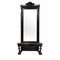 Monumental golvspegel med integrerat konsolbord, utförd i mörkbetsat trä i nyrenässansstil, troligen från sent 1800-tal eller tidigt 1900-tal. Spegeln flankeras av svarvade kolonner och avslutas upptill med profilerat krön. Nedre delen utgörs av ett konsolbord med svarvade ben och hylla undertill.