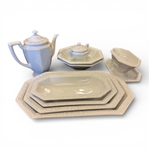 Samling servisdelar i vitt glaserat porslin från Rosenthal, formgivna i en klassisk och välbalanserad modell med diskret reliefdekor längs kanter och lock.
