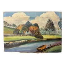 Oljemålning på duk föreställande ett stilla landskap med gårdsbebyggelse, träd och en förtöjd roddbåt vid vattendrag. Motivet är lågmält och berättande, med ett mjukt färgspel i grönt, blått och jordtoner som för tankarna till svenskt kulturlandskap under första hälften av 1900-talet.