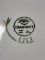 Vackert och omfattande servisset från Rörstrand, modell LILI med dekoren DIAMANT. Servisen är formgiven av J.L. (Joel Lindkvist) och har den karakteristiska blomdekoren i grönt och orange samt en mild pastellrosa kant — ett stilrent uttryck som är typiskt för Rörstrands formgivning under 1950–60-talet.