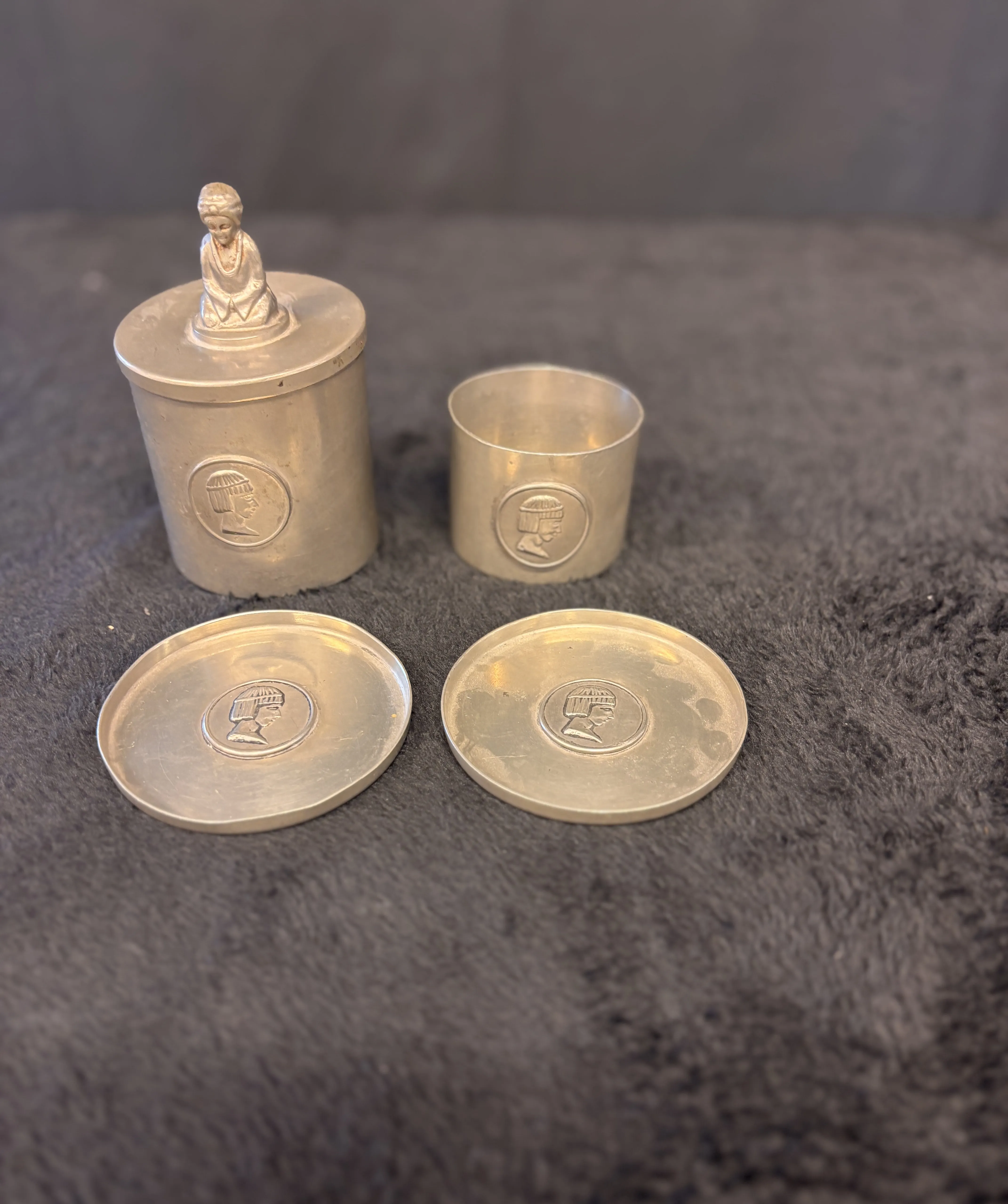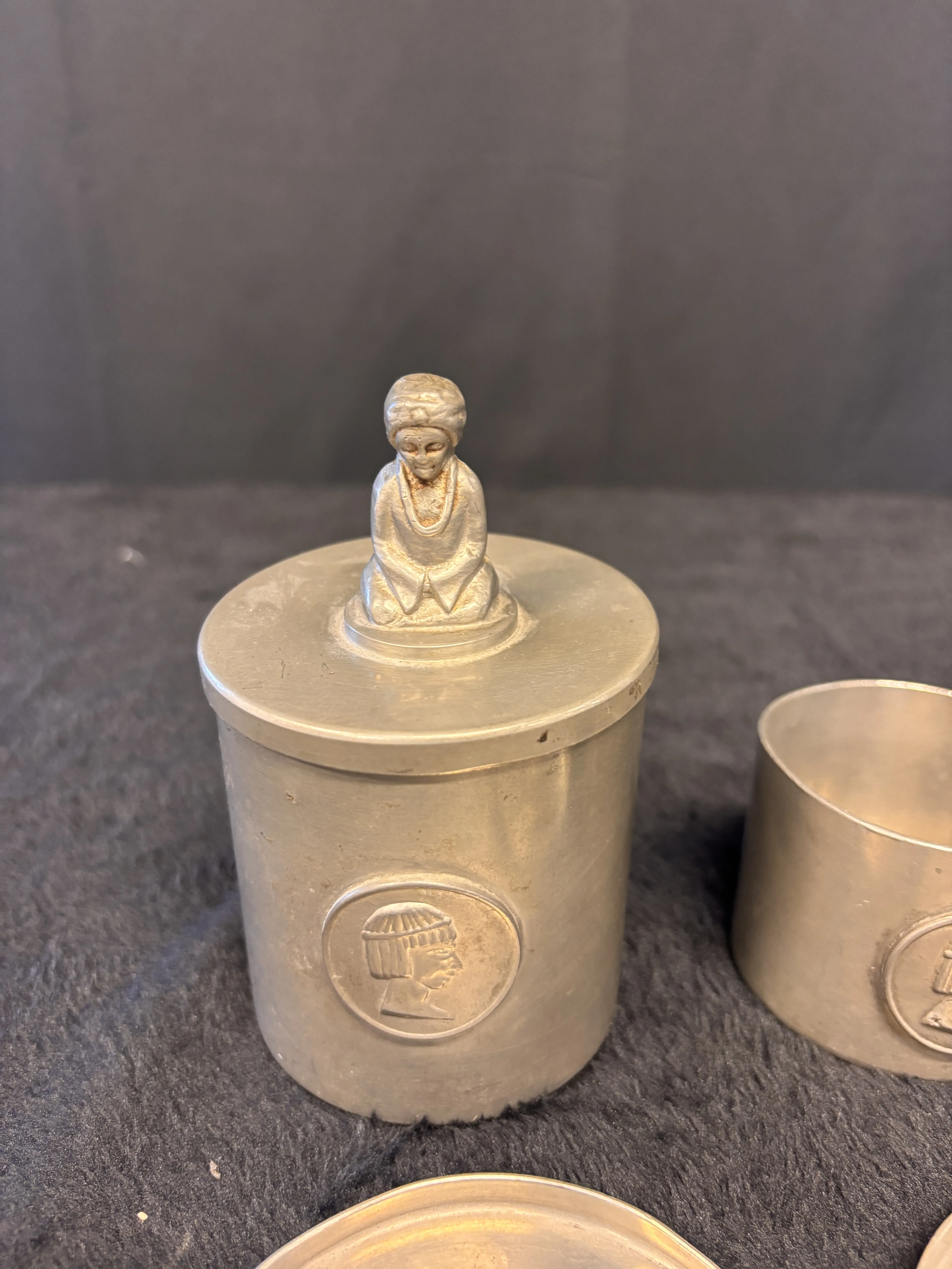 Elegant tennbehållare med lock, formgiven och utförd av OH Lagerstedt – en av de främsta tennmästarna knuten till Firman Svenskt Tenn under 1900-talets första hälft) för Svenskt Tenn. Cirkulär form med dekorativa medaljonger i relief föreställande profiler samt lock prytt med en sittande figur.