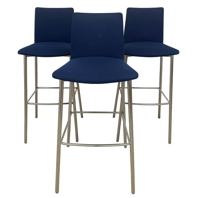 Snygga och stilrena barstolar med blå stoppad sits och ryggstöd, samt ben i kromat stål.