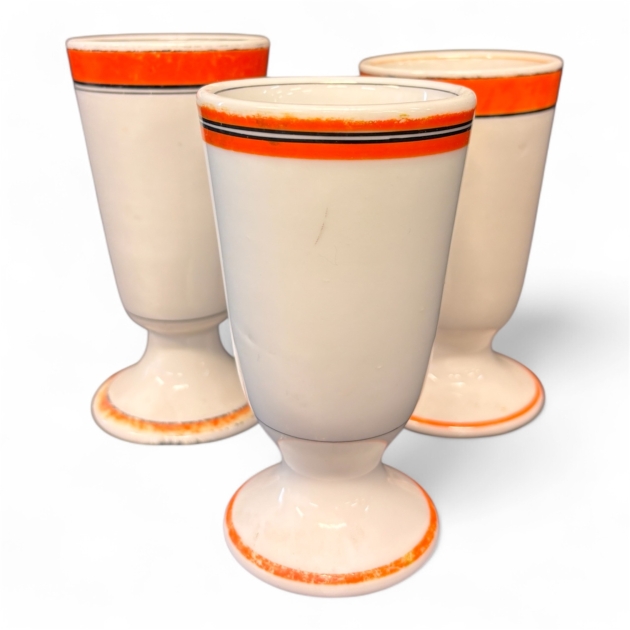 Tre vackra porslinsglas på fot, dekorerade med orange och svart rand längs kanten.