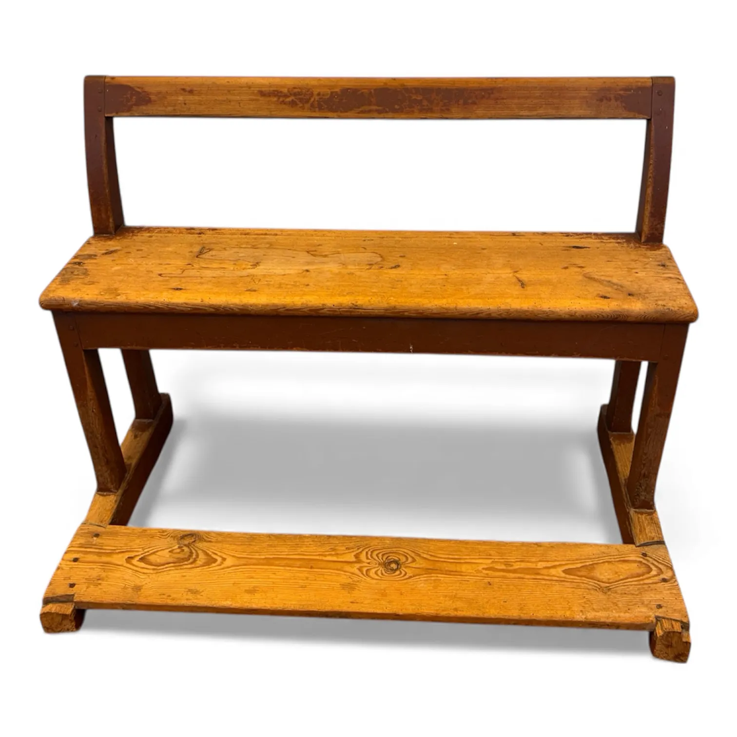 Klassisk modell med fotbräda, sits och ryggstöd, använd i svenska folkskolor under sekelskiftet.