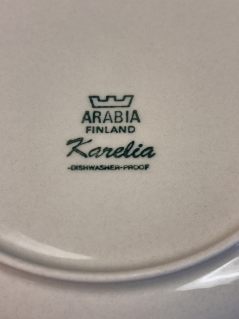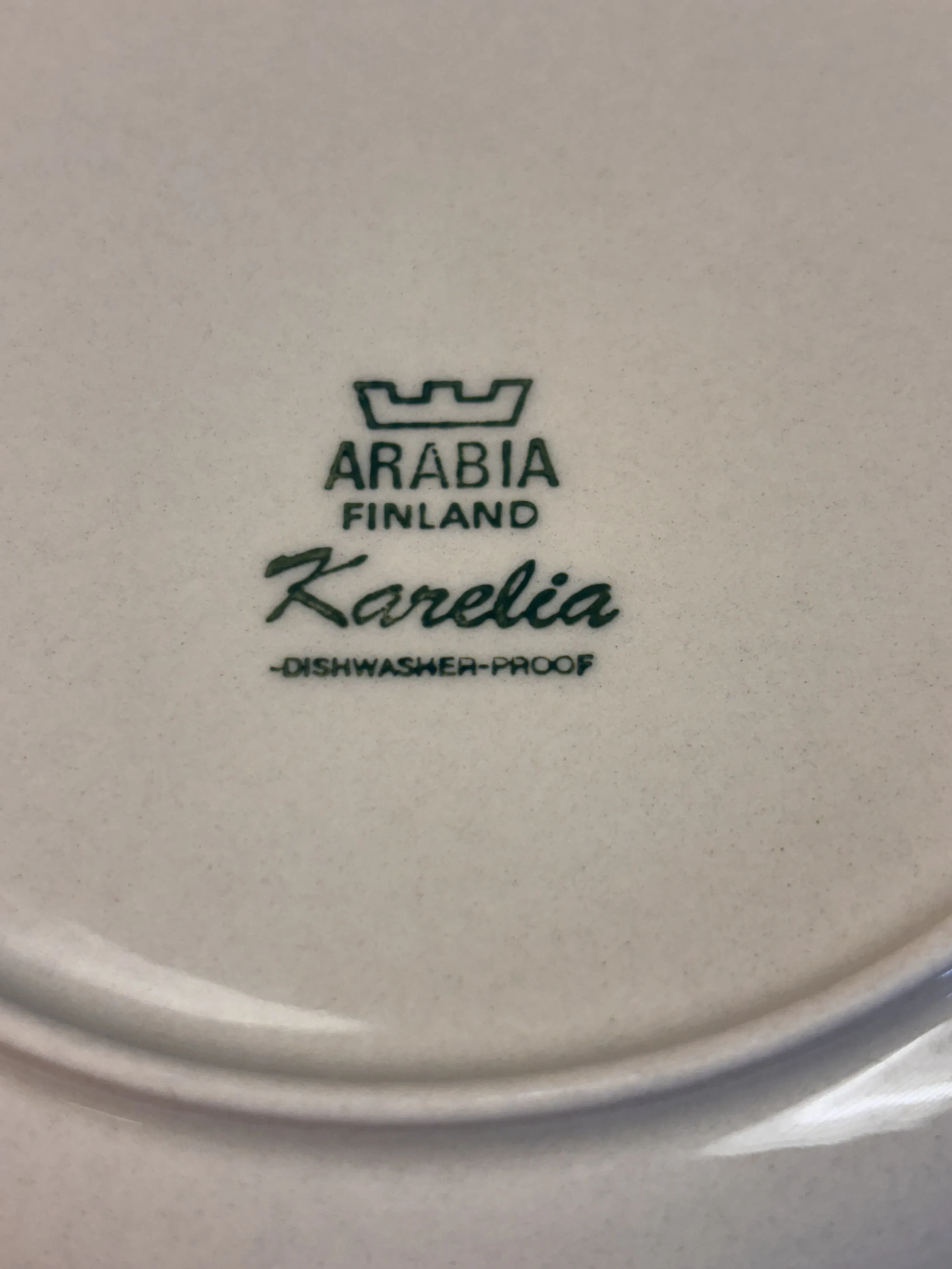 Servisdelar från Arabia Finland, serien Karelia. Klassisk nordisk design i tåligt stengods. Märkta Arabia Finland Karelia – Dishwasher-proof.
