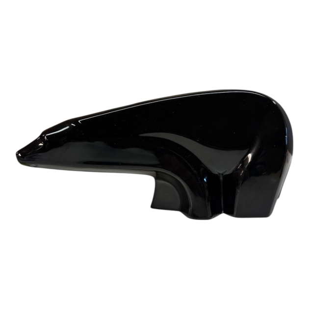 Skulptural djurfigur föreställande en liggande björn, formgiven av Bengt Nilsson för JIE Gantofta. Utförd i svartglaserad keramik med högblank yta och ett stramt, modernistiskt formspråk. Den stiliserade formen och den lågmälda elegansen är kännetecknande för Nilssons arbeten under 1900-talets senare del.