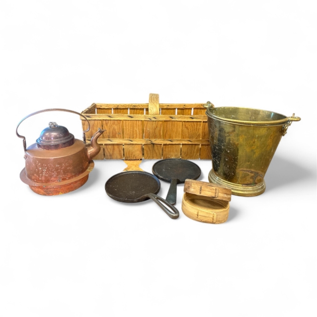 31. Blandade äldre köks- och inredningsföremål – koppar, mässing, svepask, träkorg m.m.
