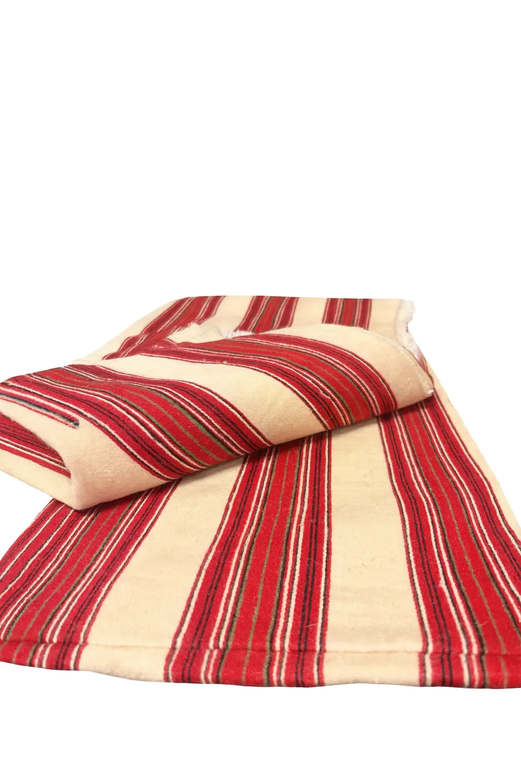 Charmigt bolstervarstyg i traditionellt mönster med röda, gröna och vita ränder på naturfärgad botten.