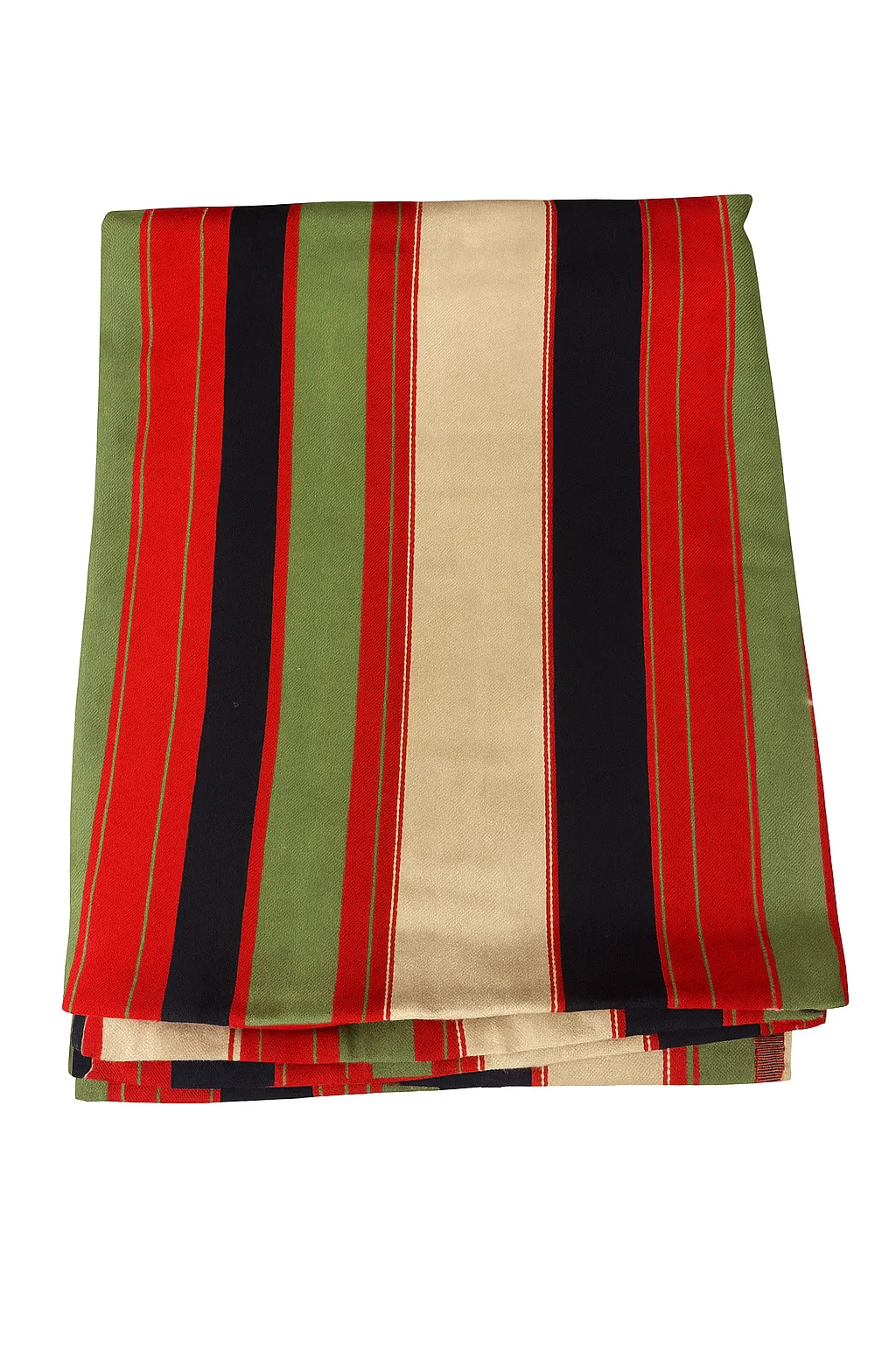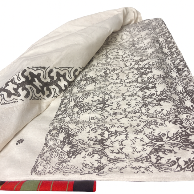Unikt bolstervarstyg i klassiskt röd-, grön-, svart- och naturrandigt mönster – fodrat med handtryckt tyg i indiskt blocktryck.