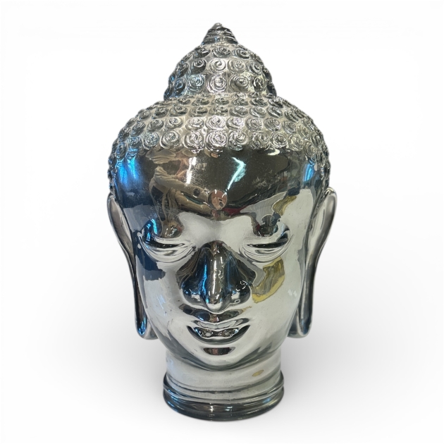 Stilrent och dekorativt Buddhahuvud i glas med spegelliknande yta. Skulpturen har ett lugnt och harmoniskt uttryck med detaljerad struktur i håret och en blank, reflekterande finish som ger ett modernt och exklusivt intryck.