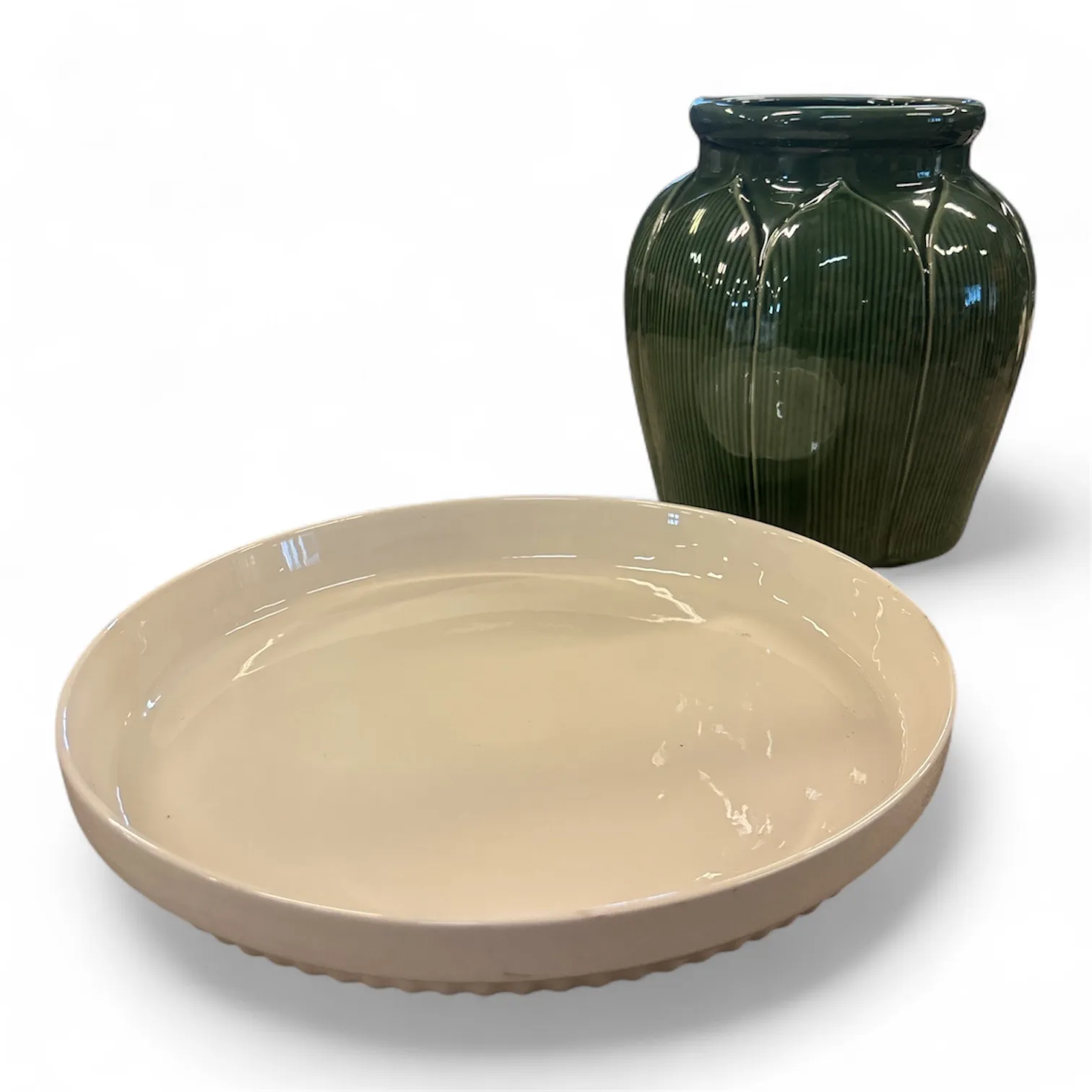 Elegant keramikset med en grön glaserad vas från Eklaholm och ett beige keramikfat från L’italia.