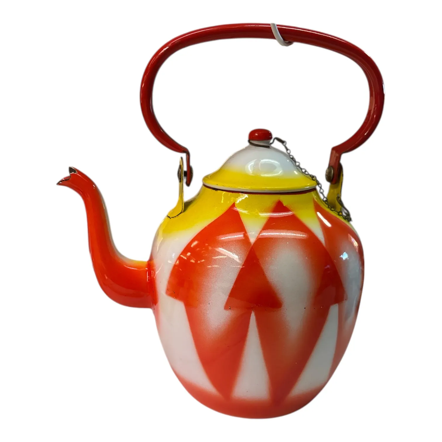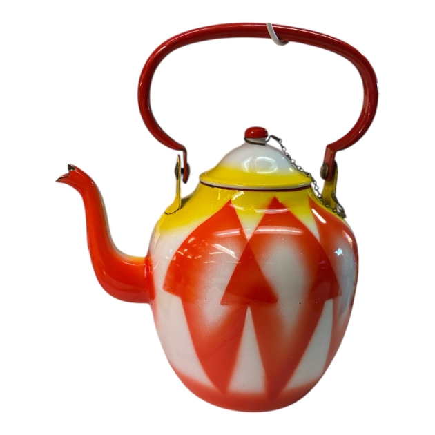 Dekorativ tekanna i emaljerad metall från EMO Celje, Jugoslavien, i ett uttrycksfullt och färgstarkt formspråk typiskt för efterkrigstidens emaljproduktion. Kannan har en rundad kropp med grafiskt mönster i rött och vitt, gulaccent vid halsen samt rött handtag. Lock med liten knopp och kedja.