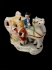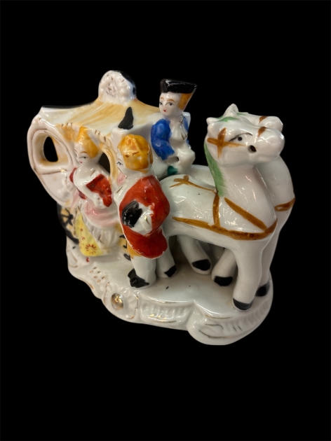 Dekorativ figur i glaserat porslin föreställande en häst framför en vagn med flera figurer i tidstypisk folkloristisk dräkt. Utförd i polykrom dekor med inslag av guldstaffering och handmålade detaljer.