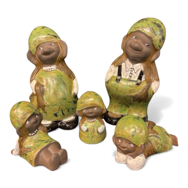 Figurerna föreställer glada barn i gröna kläder och mössor – handmålade med vackra detaljer och typisk Nyman-karaktär. Tillverkade i keramik med matt yta på ansikten och glaserade kläder.