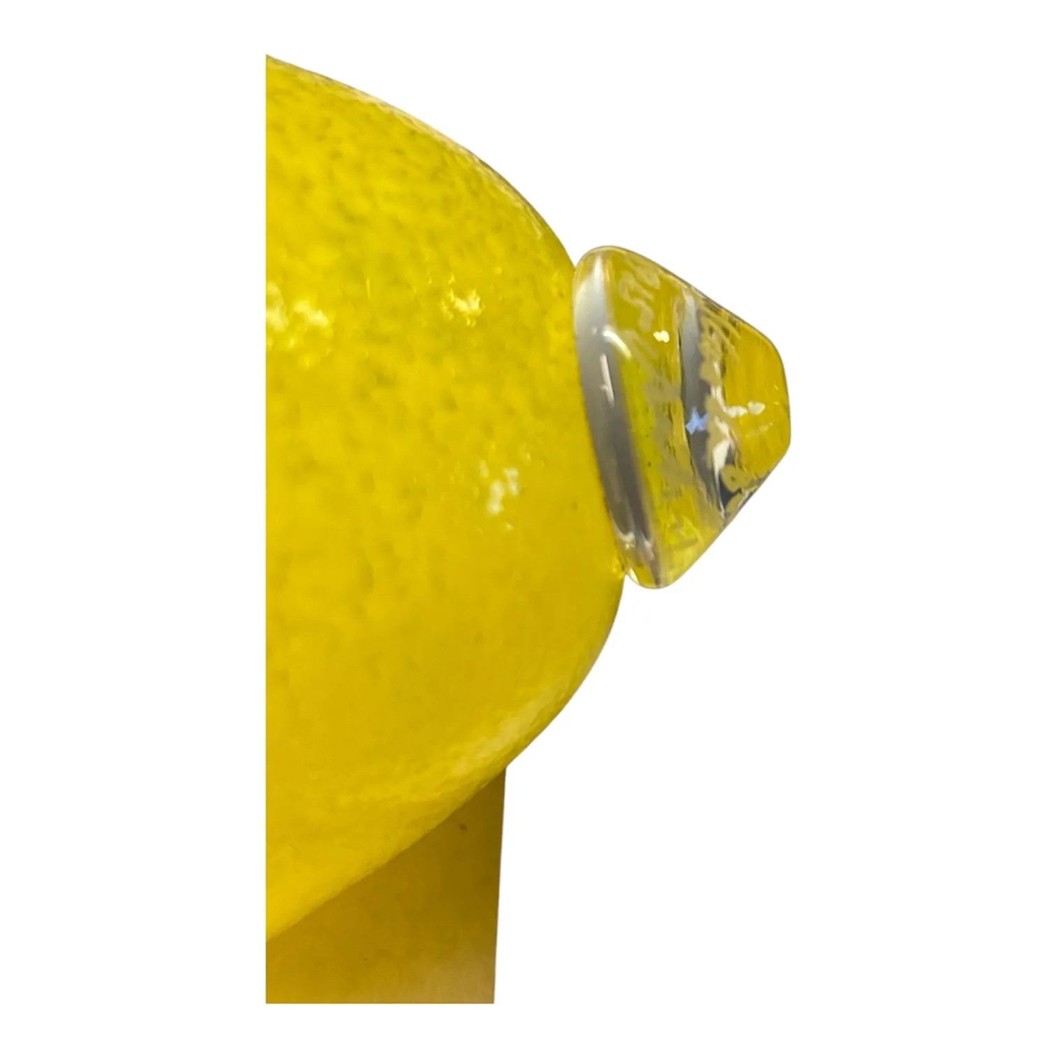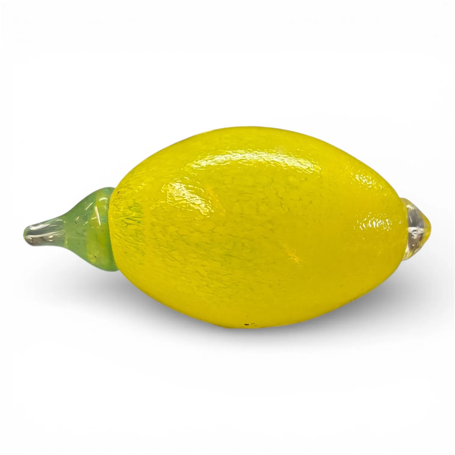 Skulptural citron i gult konstglas med klarglasavslut.