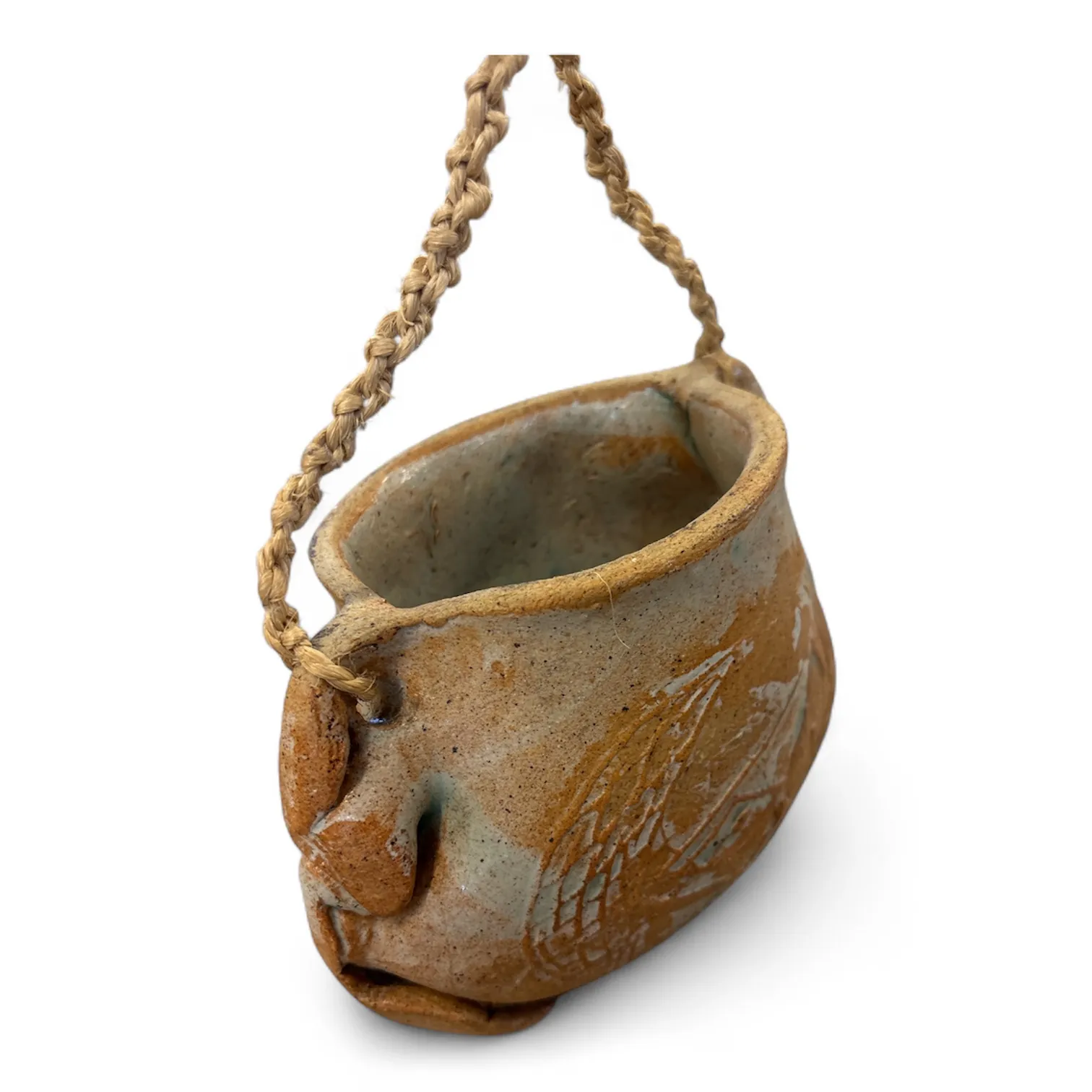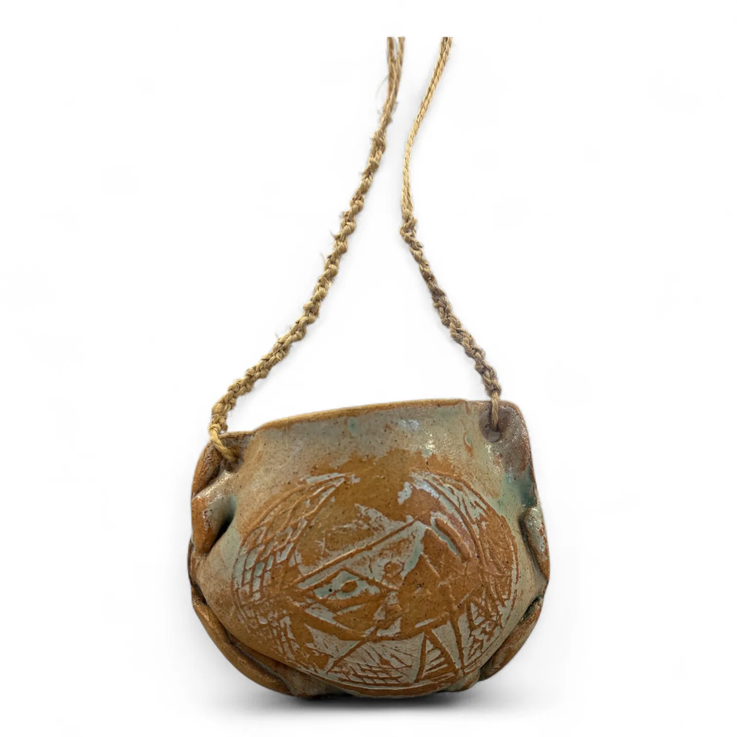 Vacker handgjord keramikkruka med naturlig glasyr i jordnära toner och flätad upphängning i jutesnöre.