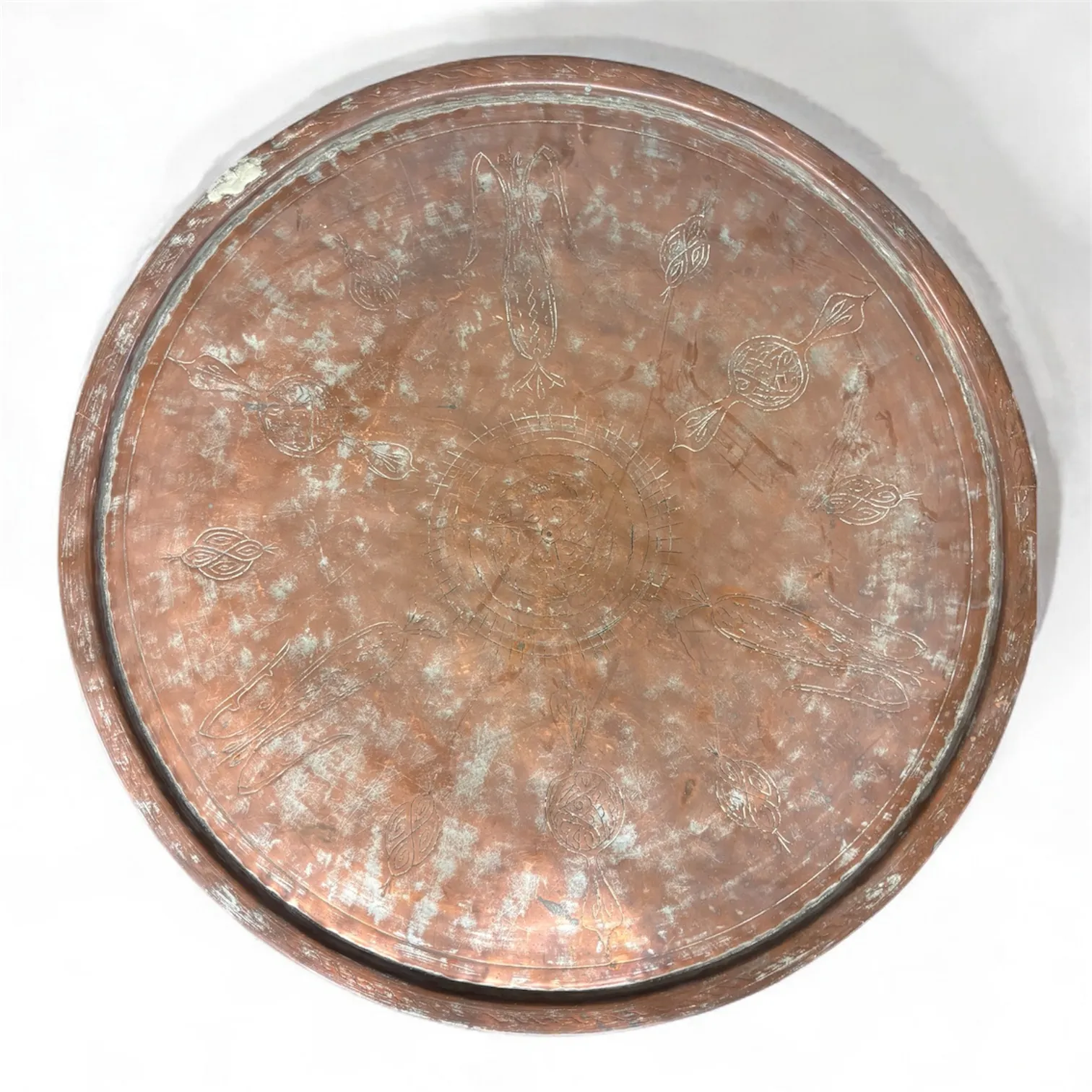 Vackert handgjort kopparfat med graverad dekor i traditionell turkisk/ottomansk stil.
