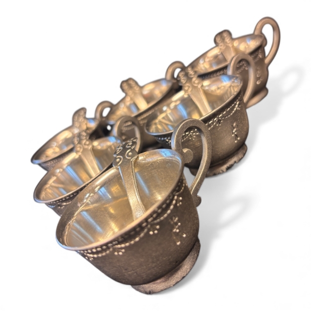 53. Handverkarnas Tinn Jokkmokk – Set om sex tennkoppar med skedar, handarbete SWÅ H10