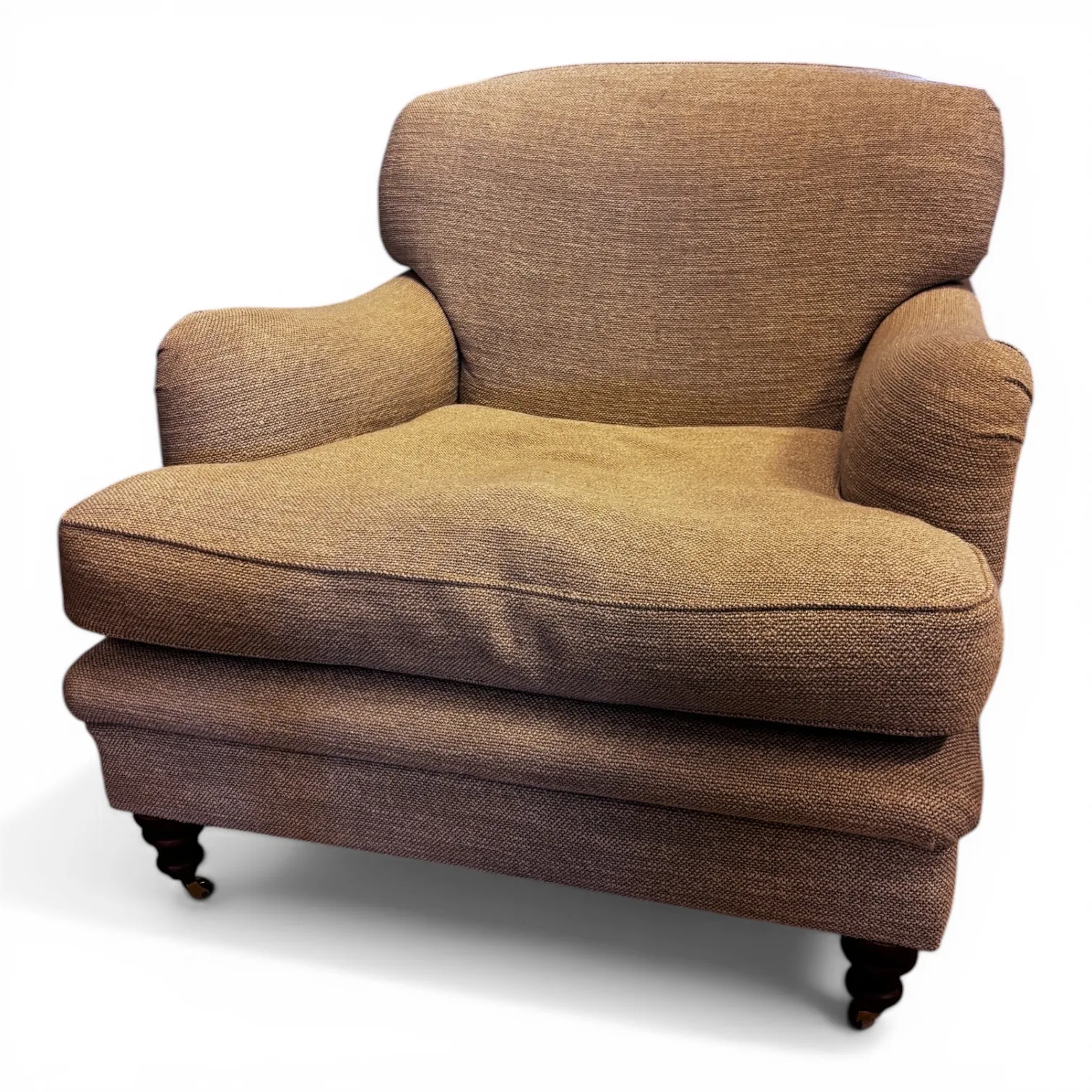 Howardfåtölj i klassisk engelsk stil med mjuka, rundade former, låga armstöd och djup sits. Klädd i brunmelerat tyg och försedd med svarvade träben framtill, vilket är typiskt för Howardmodellen.