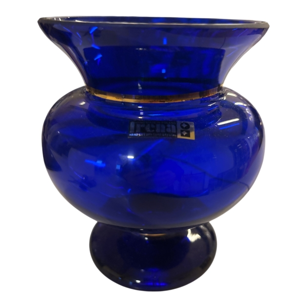 Vasen är tillverkad i djup koboltblå 24% blykristall och har en dekorativ guldfärgad bård runt halsen. Klassisk modell på fot som ger ett mycket dekorativt och exklusivt intryck. Märkt med originaletikett “Hand made in Poland – Hand cut 24% lead crystal”.