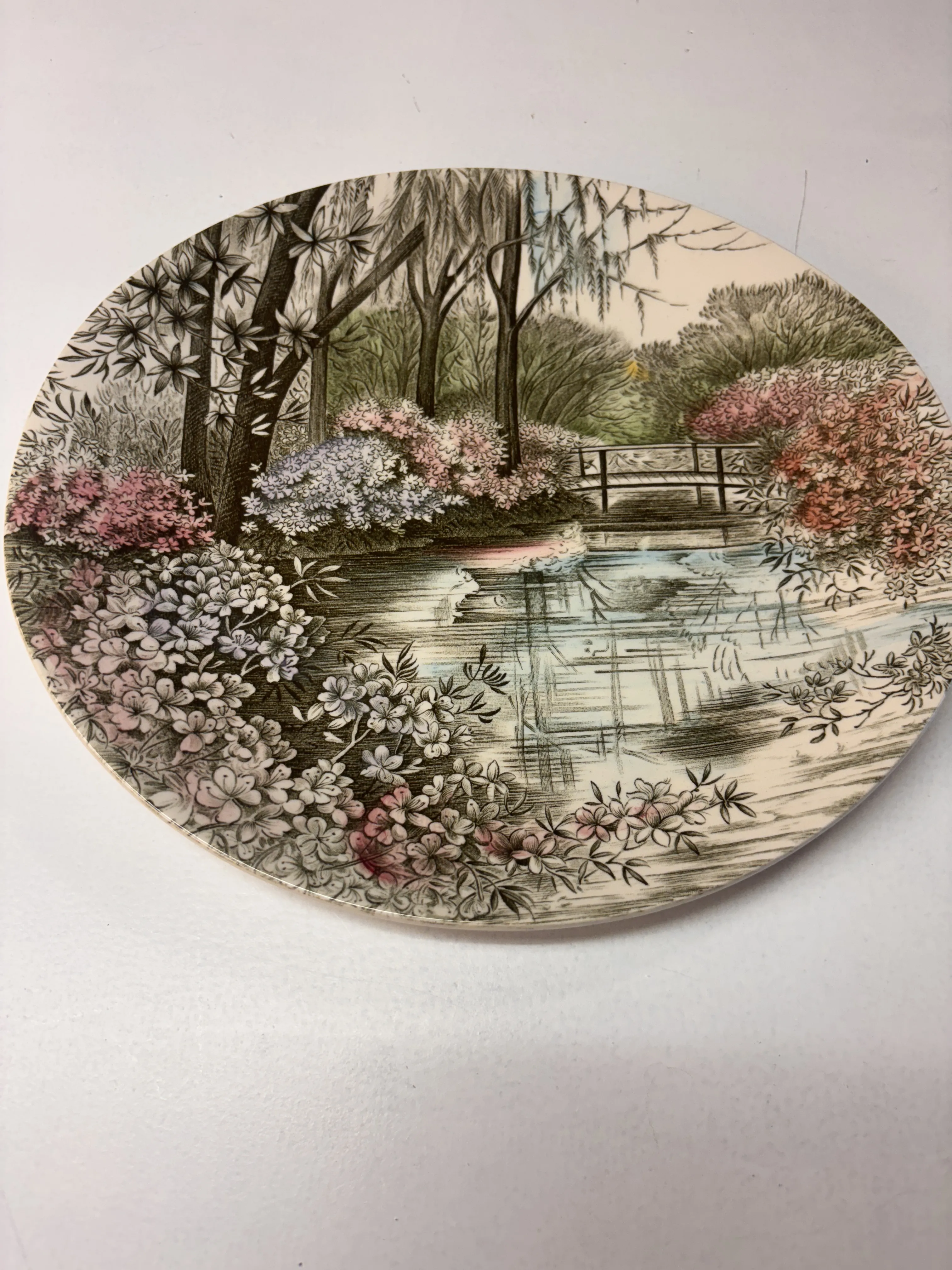 Dekorativ tallrik från Johnson Bros, England. Motiv med bro över damm och rik blomsterprakt i mjuka nyanser. Mönstret heter English Gardens och är ett exempel på Johnson Bros klassiska handgraverade underglaserade dekorer. Märkt undertill.