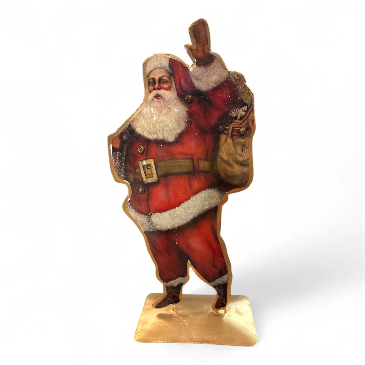 Tomte i metall – stående dekorationsfigur med säck, vacker vintageinspirerad design.