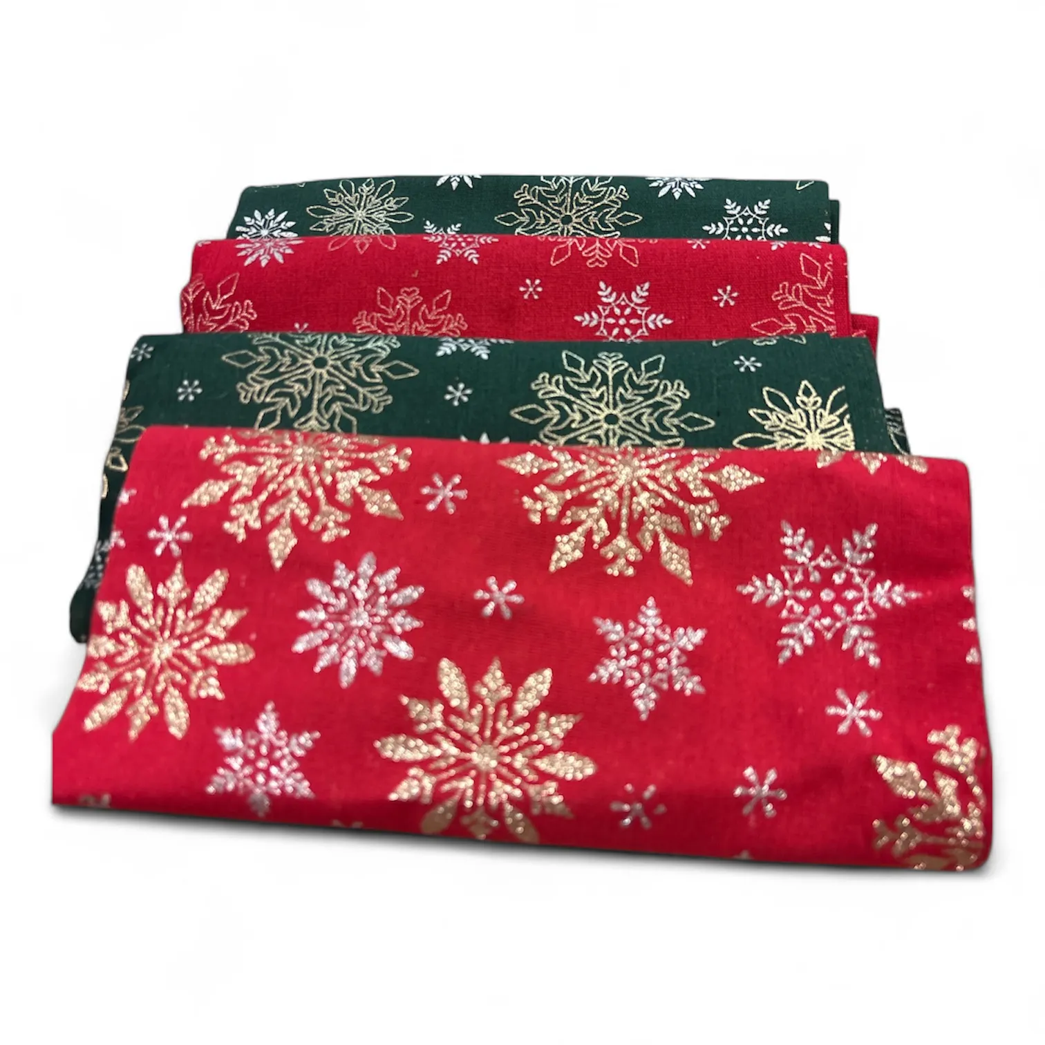 Två juldukar/löpare i rött och grönt med guldfärgade snöflingemotiv – nya och oanvända.
