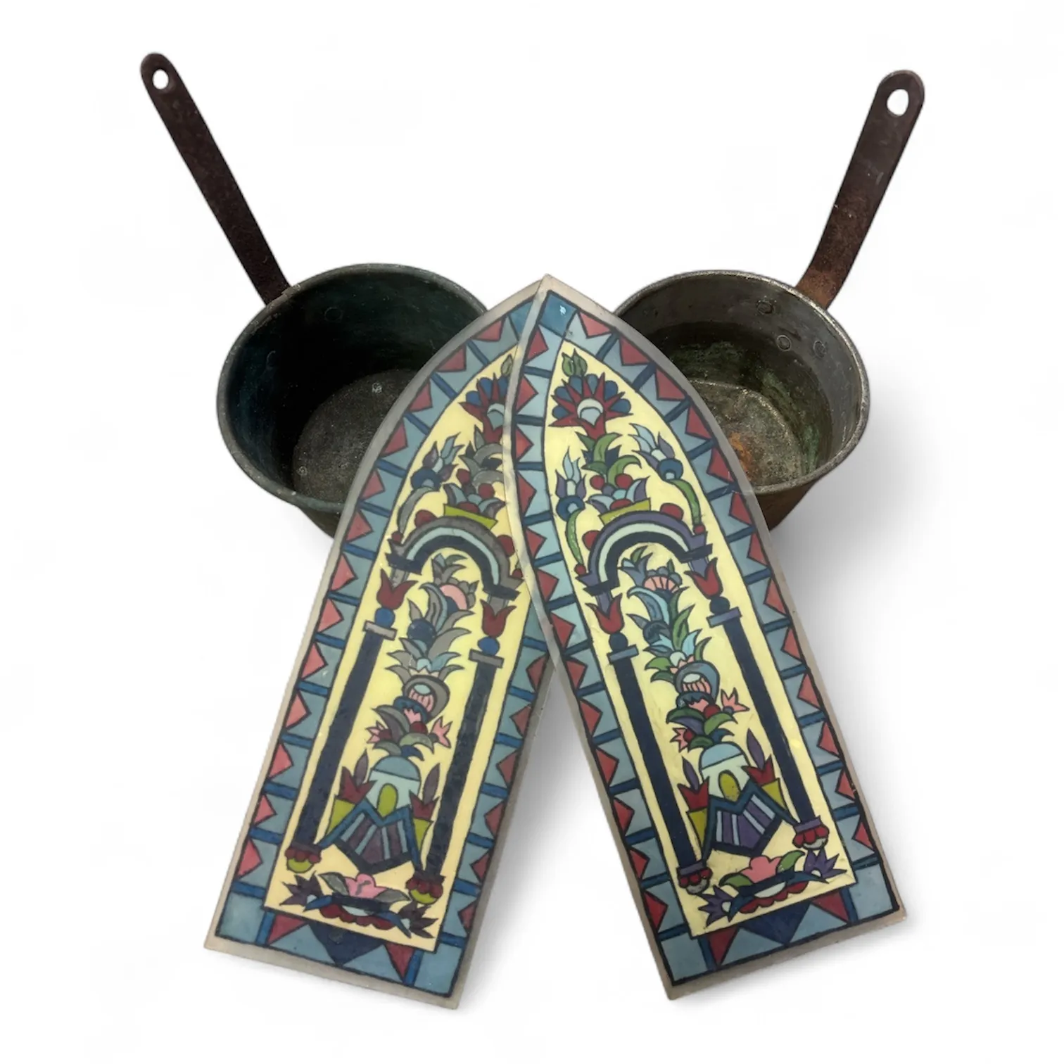 40. Köks- och inredningsparti – kopparkastruller, dekorplattor, bambuångare & bestickset