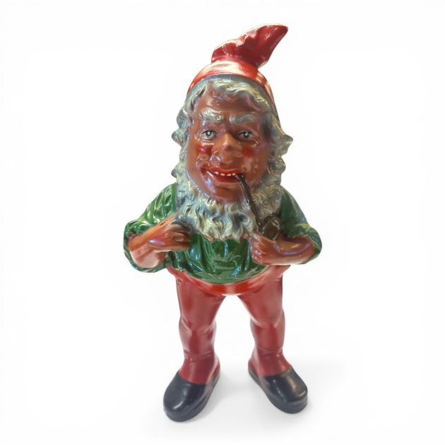 Charmig och välbevarad tomtefigur i handmålad terrakotta/lergods. Tomten bär en klassisk grön jacka och klarröda byxor samt luva. Ett tidstypiskt samlarföremål för den som uppskattar äldre tyskt hantverk.