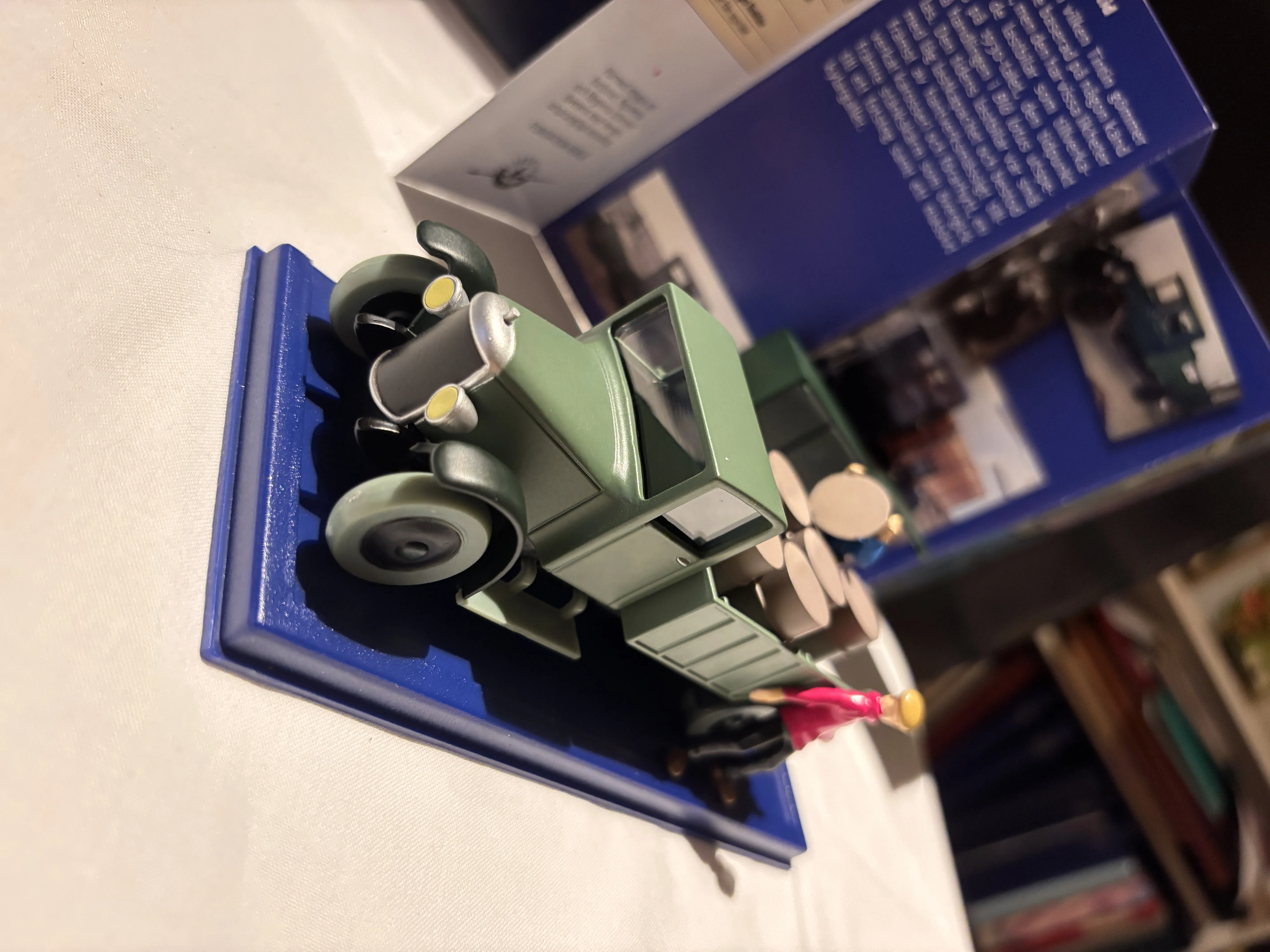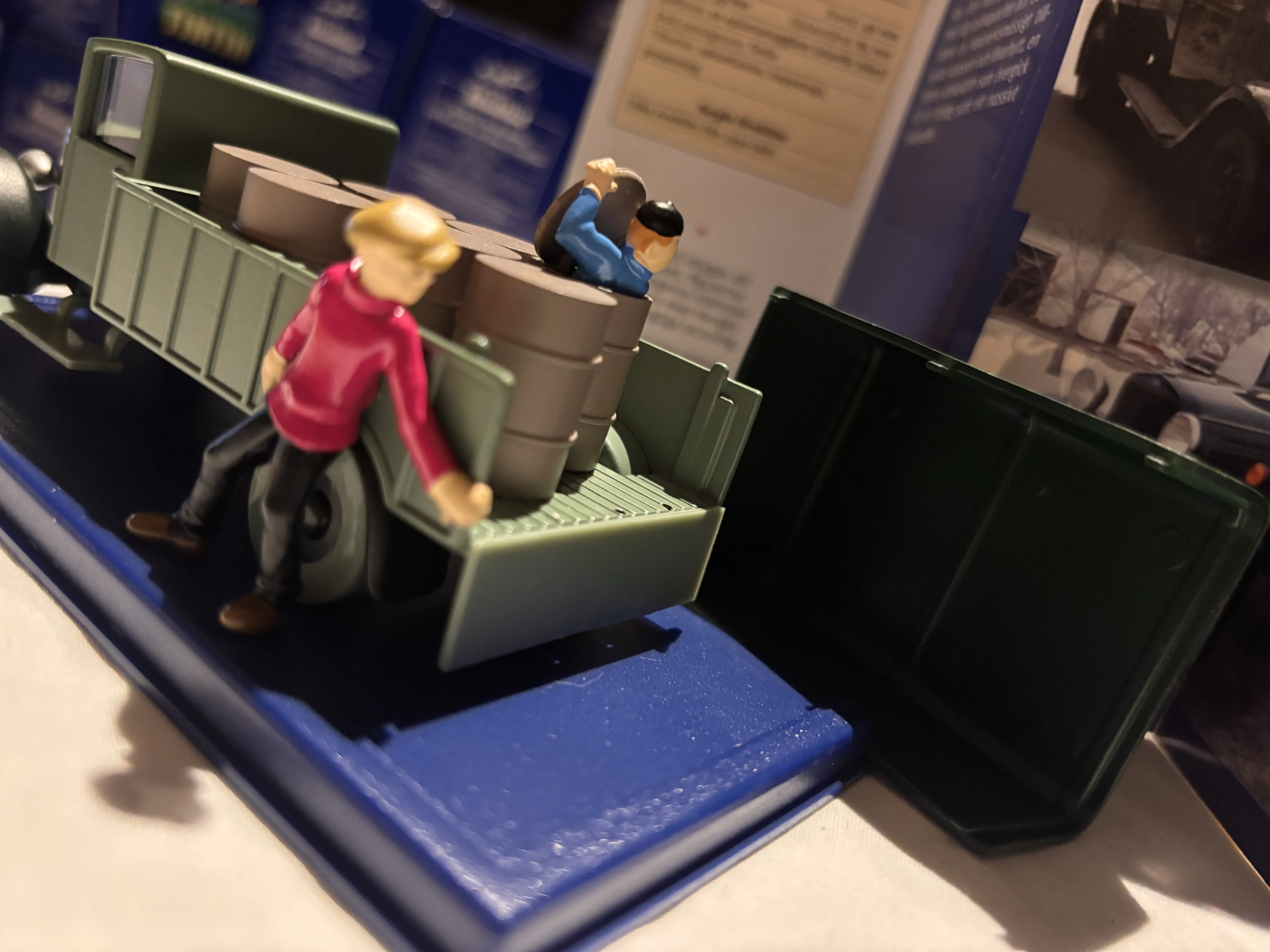 ???? Lastbil från Blå Lotus (1930-tal) – Den ikoniska lastbilen där Tintin gömmer sig. Modellen är utrustad med smugglarna i hytten, Tintin som dold passagerare, samt realistiska detaljer som trappsteg och presenning.