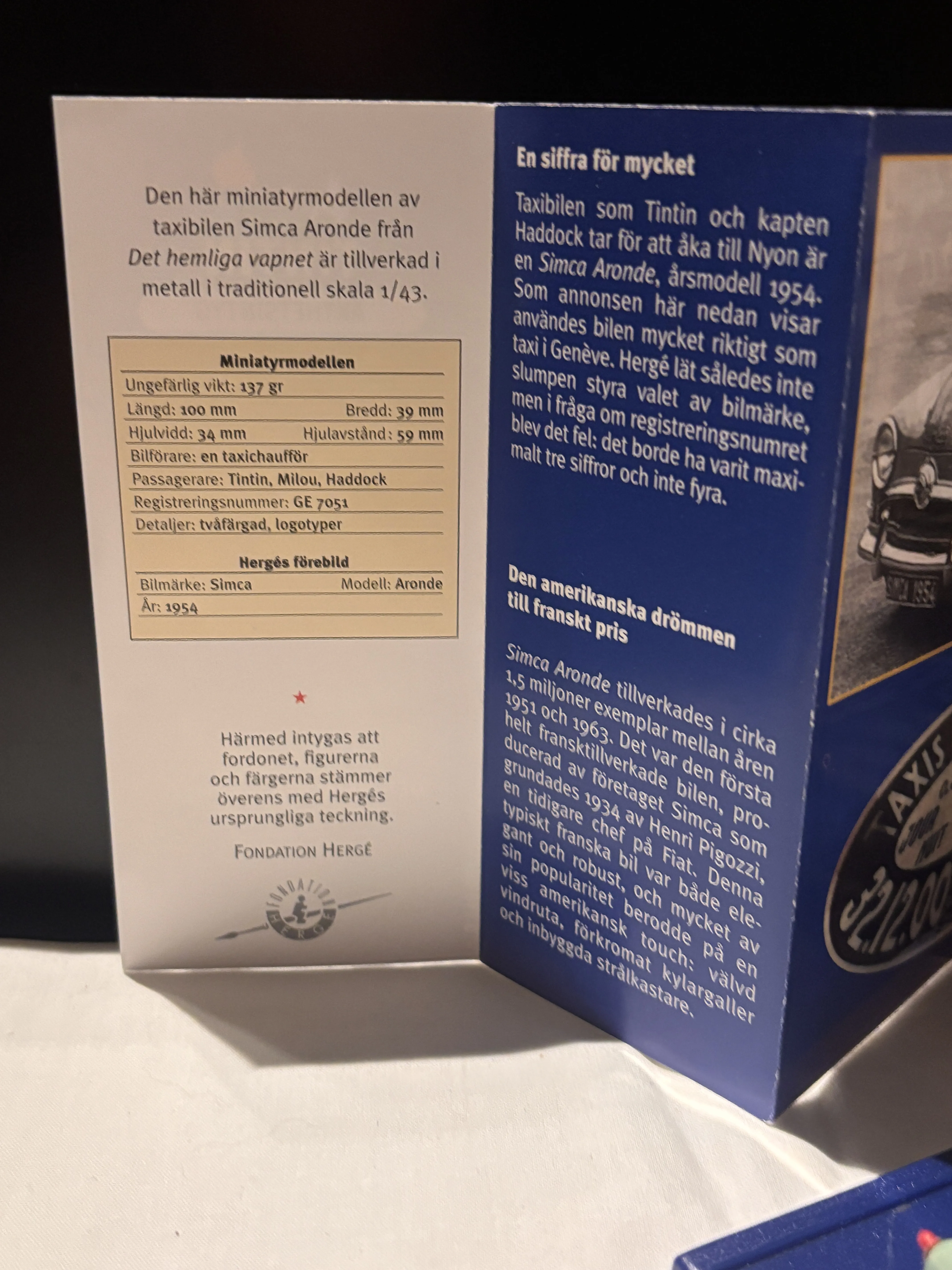 Simca Aronde Taxi (1954) – Från Det hemliga vapnet! Den tidstypiska taxin från Genève, med Tintin, Milou och Kapten Haddock som passagerare. Här i elegant utförande med logotyper och korrekt detaljering.