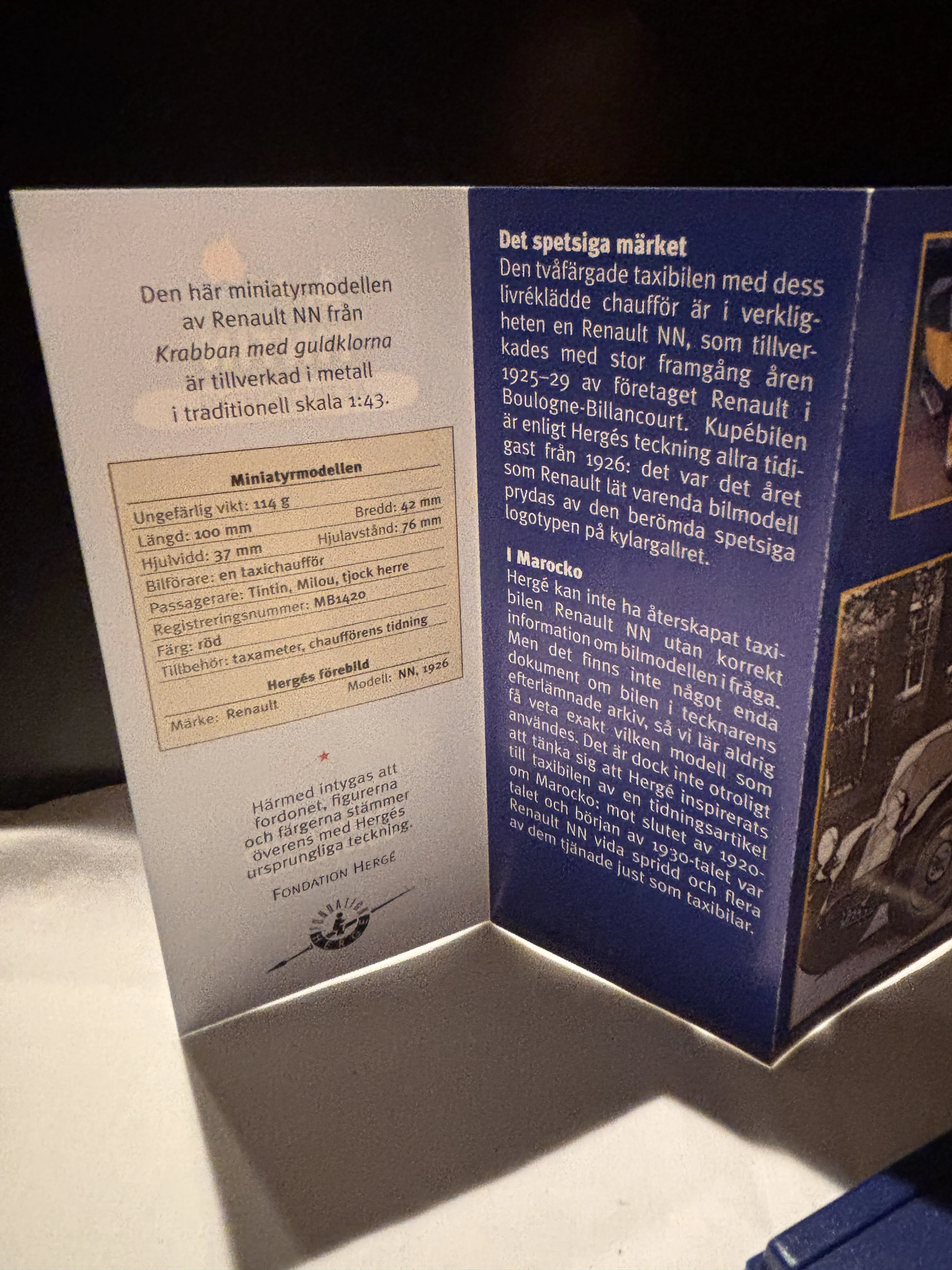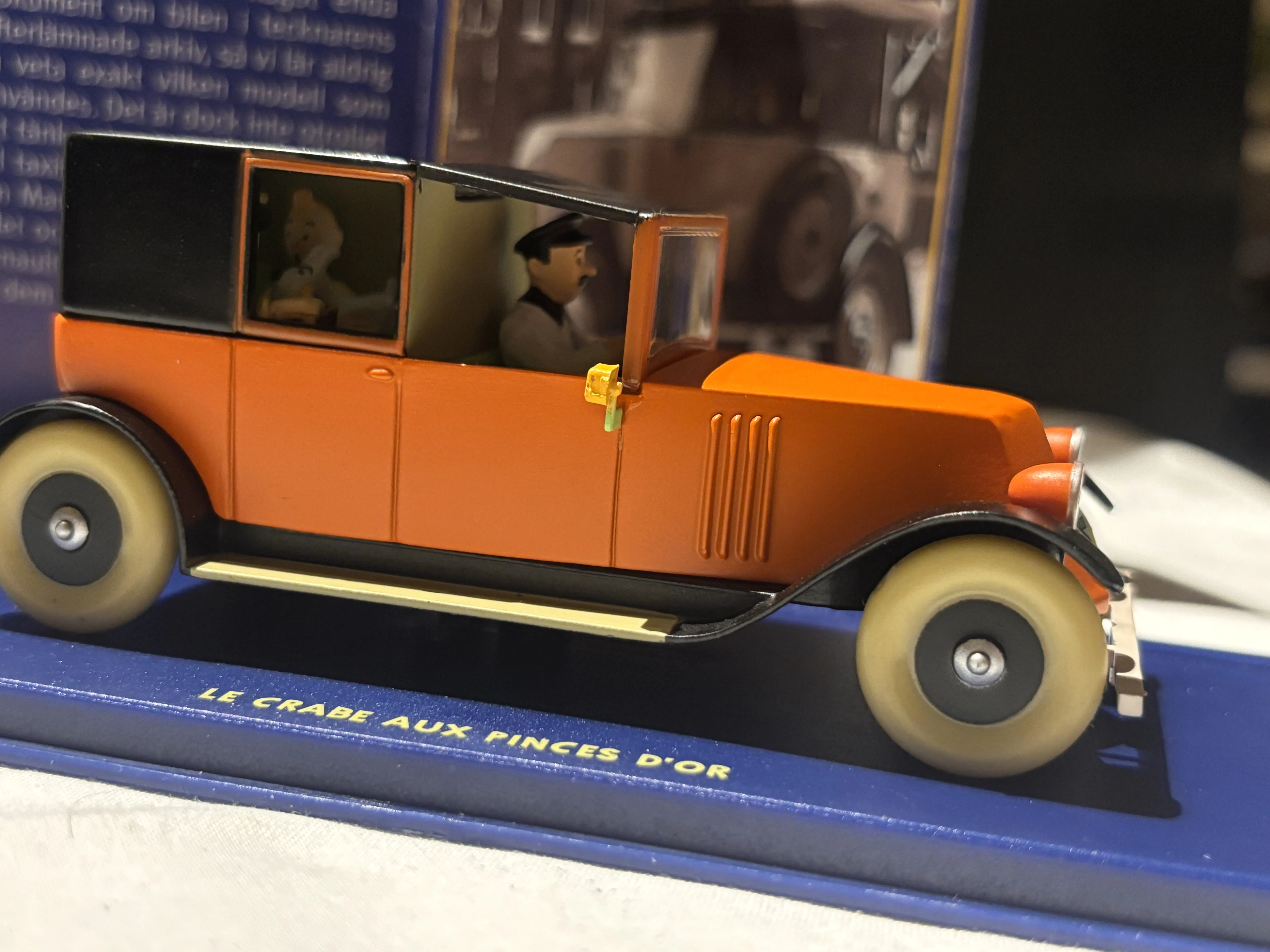 Renault NN Taxi (1926) – Från Krabban med guldklorna! En tvåfärgad röd taxi med livréklädd chaufför, taxameter och skyltar. Passagerarna är Tintin, Milou och förare, och bilen är byggd efter Renaults klassiska NN från 1926.